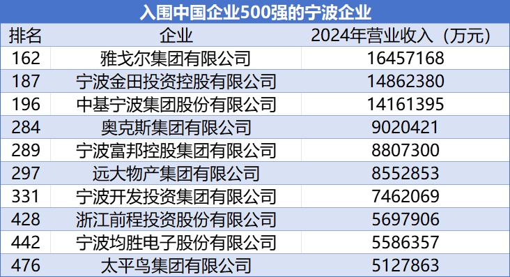\u003c/p>\u003cp class=\"textAlignCenter\">9月15日\u003c/p>\u003cp class=\"textAlignCenter\">中國企業聯合會、中國企業家協會\u003c/p>\u003cp class=\"textAlignCenter\">第24次向社會發布\u003c/p>\u003cp class=\"textAlignCenter\">“中國企業500強”榜單\u003c/p>\u003cp class=\"textAlignCenter\">其中\u003c/p>\u003cp class=\"textAlignCenter\">寧波有10家企業入圍\u003c/p>\u003cp class=\"textAlignCenter\">較去年增加2家\u003c/p>\u003cp class=\"textAlignCenter\">↓↓↓\u003c/p>\u003cp>這份榜單以2024年企業營業收入作為入圍標準。\u003c/p>\u003cp>今年中國企業500強的總營業收入達110.15萬億元,較上年有所增加;\u003c/p>\u003cp>入圍門檻實現23連升,達479.60億元,提升5.79億元;\u003c/p>\u003cp>資產總額為460.85萬億元,增長7.46%。\u003c/p>\u003cp>\u003cimg src=\"https://x0.ifengimg.com/ucms/2025_38/7D7AFBAEA59035F82EF4902745EC33DC77A8C9E2_size31_w732_h397.png\" />\u003c/p>\u003cp>入圍的10家甬企基本代表了寧波經濟的整體結構:\u003c/p>\u003cp>有以紡織服裝起家、多元經營的成功典型\u003cstrong>雅戈爾集團有限公司、太平鳥集團\u003c/strong>;\u003c/p>\u003cp>有以礦石金屬新材料為主業的\u003cstrong>寧波金田投資控股有限公司\u003c/strong>;\u003c/p>\u003cp>有以制造業為主體、多元產業協同發展的\u003cstrong>寧波富邦控股集團有限公司\u003c/strong>;\u003c/p>\u003cp>有代表寧波大宗商品貿易和一般貿易的龍頭\u003cstrong>中基寧波集團股份有限公司、遠大物產集團有限公司\u003c/strong>;\u003c/p>\u003cp>有家電業龍頭、旗下電氣板塊剛剛登陸港交所的\u003cstrong>奧克斯集團有限公司\u003c/strong>;\u003c/p>\u003cp>有綠色石化龍頭\u003cstrong>浙江前程投資股份有限公司\u003c/strong>;\u003c/p>\u003cp>有汽車零部件和具身智能領域的全球龍頭\u003cstrong>寧波均勝電子股份有限公司\u003c/strong>;\u003c/p>\u003cp>以及建筑行業的代表、唯一入圍的寧波國資企業\u003cstrong>寧波開發投資集團有限公司\u003c/strong>。\u003c/p>\u003cp>其中,\u003cstrong>前程投資、太平鳥為今年新入圍企業\u003c/strong>。\u003c/p>\u003cp>綜合來看,今年的“中國企業500強” 呈現以下特點:\u003c/p>\u003cp>\u003cstrong>經濟效益繼續改善。\u003c/strong>中國企業500強歸母凈利潤總額為4.71萬億元,增長4.39%;收入凈利潤率為4.27%,提高0.17個百分點。\u003c/p>\u003cp>\u003cstrong>創新活力更加充沛。\u003c/strong>研發強度創新高。中國企業500強共投入研發費用1.73萬億元;研發強度創下1.95%的新高,連續8年提升。\u003c/p>\u003cp>創新成果產出質量繼續提升。中國企業500強持有有效專利總數224.37萬件,比上年增加21.40萬件,增長10.54%。其中,持有發明專利103.96萬件,較上年增加15萬件,增長16.86%;發明專利數量連續6年保持增長;發明專利占全部專利的46.33%,比上年提高2.50個百分點。專利質量穩步提升。\u003c/p>\u003cp>\u003cstrong>產業結構持續優化。\u003c/strong>先進制造業和現代服務業企業入圍數量增加。中國企業500強中,有39家新入圍或重新入圍企業。其中,汽車及零部件制造、物流及供應鏈企業增加最多,共有6家新入圍企業。\u003c/p>\u003cp>計算機通信設備及其他電子設備制造業、電信及互聯網信息服務等行業多項指標領先,在研發費用、專利、標準等方面貢獻突出。\u003c/p>\u003cp>\u003cstrong>發展協調性有所增強。\u003c/strong>制造業、服務業和其他行業企業發展齊頭并進。中國企業500強中,制造業、服務業和其他行業對營收總額增長的貢獻分別為40.48%、40.29%、19.23%。\u003c/p>\u003cp>“2025中國跨國公司100大及跨國指數”“2025中國戰略性新興產業領軍企業100強”“2025中國大企業創新100強” 等各項榜單同時發布。\u003c/p>\u003cp class=\"textAlignCenter\">\u003cstrong>“2025中國企業500強”\u003c/strong>\u003c/p>\u003cp class=\"textAlignCenter\">\u003cstrong>完整榜單如下\u003c/strong>\u003c/p>\u003cp class=\"textAlignCenter\">\u003cstrong>↓↓↓\u003c/strong>\u003c/p>\u003cp class=\"textAlignCenter\">(上下滑動查看)\u003c/p>\u003cp>\u003cimg src=\"https://x0.ifengimg.com/ucms/2025_38/C51180E1686A6609EB0B6990EF7F7238AD876224_size1253_w1080_h4190.png\" />\u003c/p>\u003cp>\u003cimg src=\"https://x0.ifengimg.com/ucms/2025_38/4B914F6EC0607502CF655F08C022690E9820DB54_size1290_w1080_h4149.png\" />\u003c/p>\u003cp>\u003cimg src=\"https://x0.ifengimg.com/ucms/2025_38/B659D855F1A1CE75D2A01A0531BE1A5B05F2D234_size1299_w1080_h4149.png\" />\u003c/p>\u003cp>\u003cimg src=\"https://x0.ifengimg.com/ucms/2025_38/20D4F0DAB6CE5B09DA859BC029E69183A287E08A_size1335_w1080_h4149.png\" />\u003c/p>\u003cp>\u003cimg src=\"https://x0.ifengimg.com/ucms/2025_38/1DCAA528D1D221FB05392A209A9AFD444DEA5113_size1318_w1080_h4149.png\" />\u003c/p>\u003cp>來源:寧波發布\u003c/p>","type":"text"}],"currentPage":0,"pageSize":1},"editorName":"謝思潔","faceUrl":"http://ishare.ifeng.com/mediaShare/home/548308/media","vestAccountDetail":{},"subscribe":{"type":"vampire","cateSource":"","isShowSign":0,"parentid":"0","parentname":"社會","cateid":"548308","catename":"鳳凰網寧波","logo":"https://d.ifengimg.com/q100/img1.ugc.ifeng.com/newugc/20201010/11/wemedia/5a68ca01a436772927546cfba868774629fcaea8_size286_w1600_h1600.jpg","description":"鳳凰網寧波頻道,每天向您傳播寧波最新最快新聞資訊。","api":"http://api.3g.ifeng.com/api_wemedia_list?cid=548308","show_link":1,"share_url":"https://share.iclient.ifeng.com/share_zmt_home?tag=home&cid=548308","eAccountId":548308,"status":1,"honorName":"","honorImg":"http://x0.ifengimg.com/cmpp/2020/0907/1a8b50ea7b17cb0size3_w42_h42.png","honorImg_night":"http://x0.ifengimg.com/cmpp/2020/0907/b803b8509474e6asize3_w42_h42.png","for