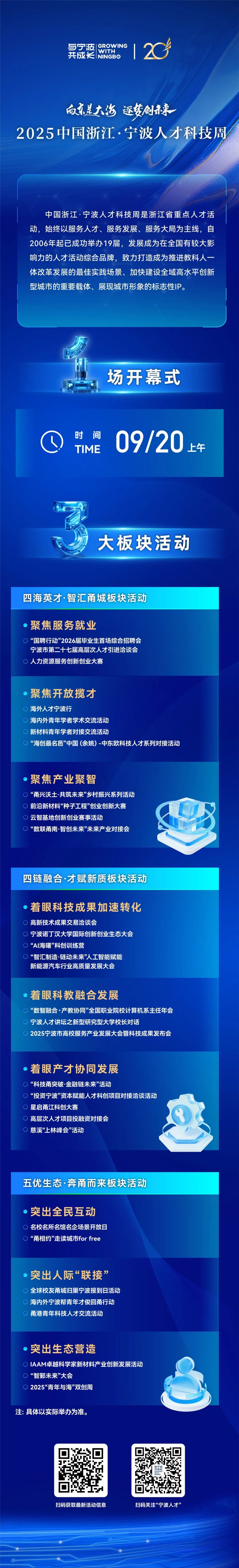 for (var i = 0,len = adKeys.length; i 寧波人才科技周,二十年再出發;四海英才,奔甬而來。 2025中國浙江·寧波人才科技周,將于9月20日在啟幕。本屆活動將聚焦教科人一體改革發展 、科技創新與產業創新深度融合、人工智能全面賦能等方面展開。 今年恰逢人才科技周舉辦二十周年,活動將全面升級,以“政府統籌、市場主導”為模式,通過場景化、沉浸式體驗,與企業、高校、科研機構、數字化平臺深度互動,讓人才和各類主體成為真正的參與者、推動者和受益者,進一步展現寧波創新活力和城市魅力。 本屆人才科技周設置1場開幕式和3大板塊,共30項主體活動,系統構建“需求牽引、場景驅動、各方參與”的立體化引才育才生態。 廣納四海英才,智“匯”甬城。本屆人才科技周期間,將通過“高洽會”、海外人才寧波行等活動,面向青年大學生、海外高端人才等,開展精準對接,鏈接全球。結合各地產業特色,組織賽事引才、產智對接、鄉村運營CEO路演等,面向青年大學生、海外高端人才、產業精英等多層次群體,更好促進以產聚才、以才興產,加速人才與城市雙向奔赴。 著眼科技成果轉化與產學研協同,活動期間,還將舉辦高交會、AI科創訓練營、高校服務產業發展大會、科創大賽等,推動創新鏈、產業鏈、資金鏈與人才鏈深度融合,為寧波新質生產力發展注入持續動能。 突出全民互動,是本屆活動的一大亮點。期間,將推出名校名所名館名企場景開放日、“甬相約”城市漫步、寧波幫回甬行動、甬港青年科技人才交流等互動活動,增強人才情感認同,打響寧波人才科技周引才聚才主品牌,構建“引得進、留得住、用得好”的人才生態。 來源:寧波組工讓人才成為“主角”!寧波人才科技周二十載再啟航