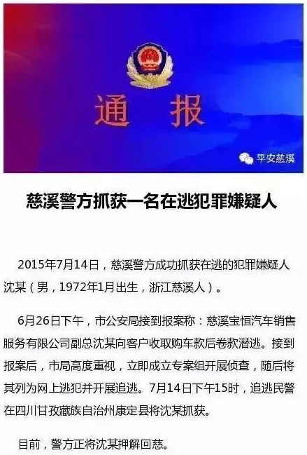 最新消息:今天(7月15日)中午12:53分,慈溪公安官方微博發布通報:慈溪警方抓獲一名在逃犯罪嫌疑人。7月14日下午3點,追逃民警在四川甘孜藏族自治州康定縣將沈某抓獲。