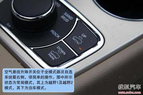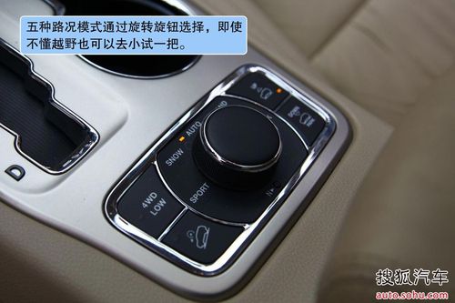 而在越野方面,新大切也增加了一套終極利器,就是被稱為“Selec-Terrain全地形模式自選系統(tǒng)”的東西,這套系統(tǒng)的操控區(qū)域位于變速桿后側(cè)。這套系統(tǒng)的原理類似于路虎的全地形反饋系統(tǒng),也是繼路虎之后第二款采用類似系統(tǒng)的越野車。它的核心功能為五種路況模式的選擇,分別為巖石模式、沙地/泥地模式、自動(dòng)模式、雪地模式以及運(yùn)動(dòng)模式,通過中央控制旋鈕可以輕松選擇。其左側(cè)分布了低速四驅(qū)以及陡坡緩降鍵,右側(cè)則為空氣懸掛的升降控制。